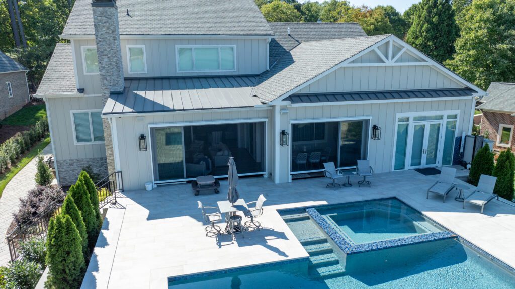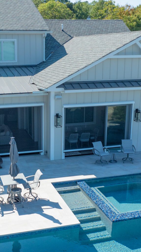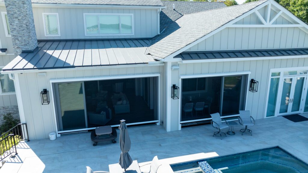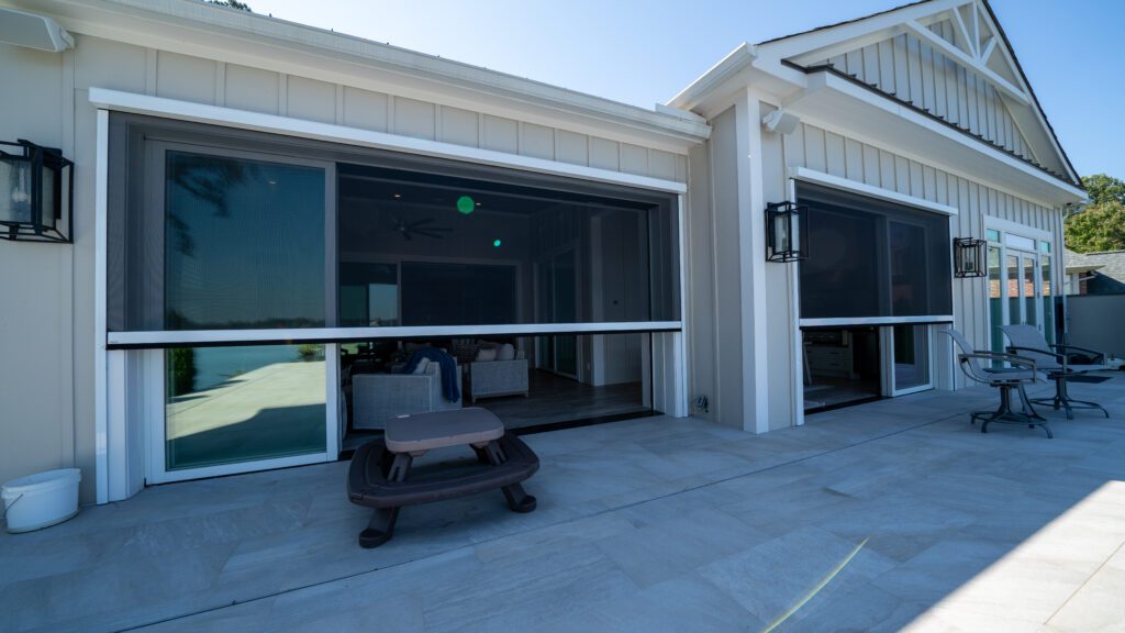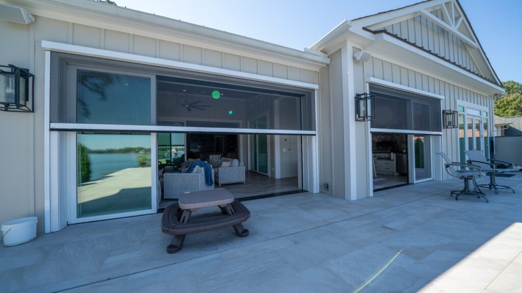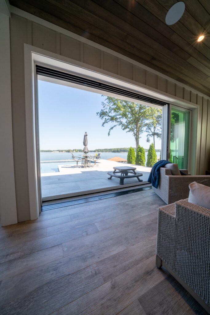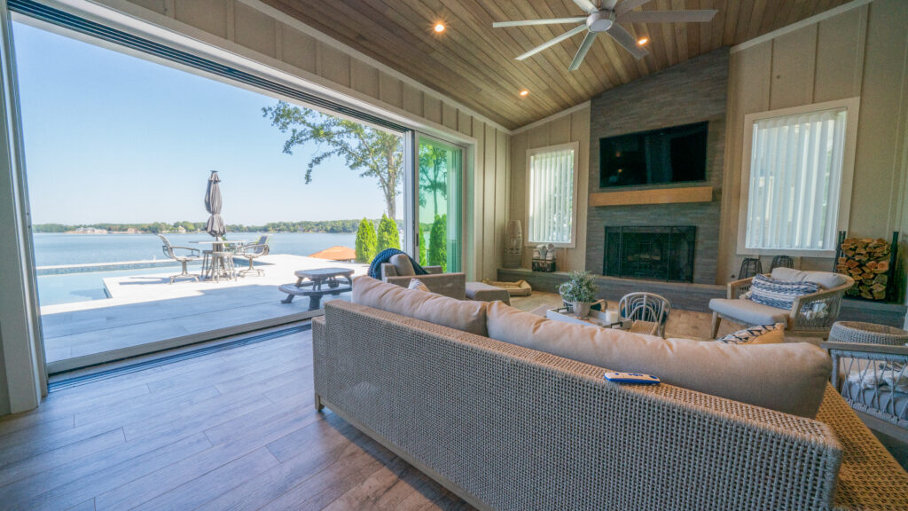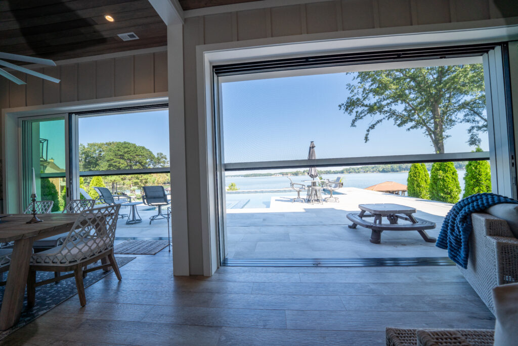 Channel Point Lane A recent renovation on a lakeside property included the installation of a motorized screen, turning the back of the house into a perfect entertainment space with breathtaking lake views.