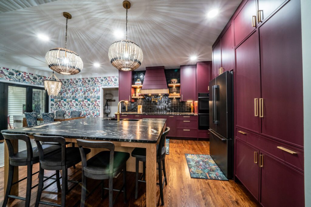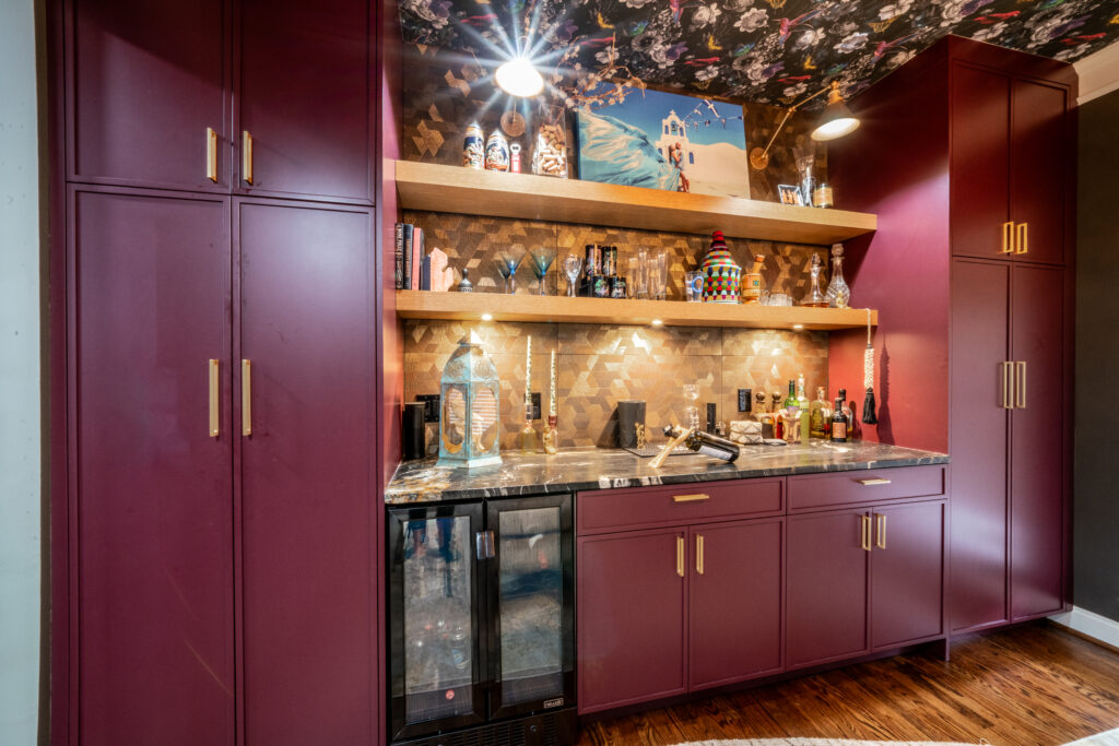 This kitchen and bar remodel was designed to be moody, bold and sleek. The wallpaper is the perfect accent piece and the dark, sexy countertops and backsplash give this kitchen a uniqueness and wow factor. To complete the room is a completely decked out bar, perfect for entertaining.
