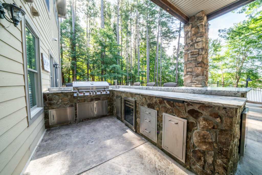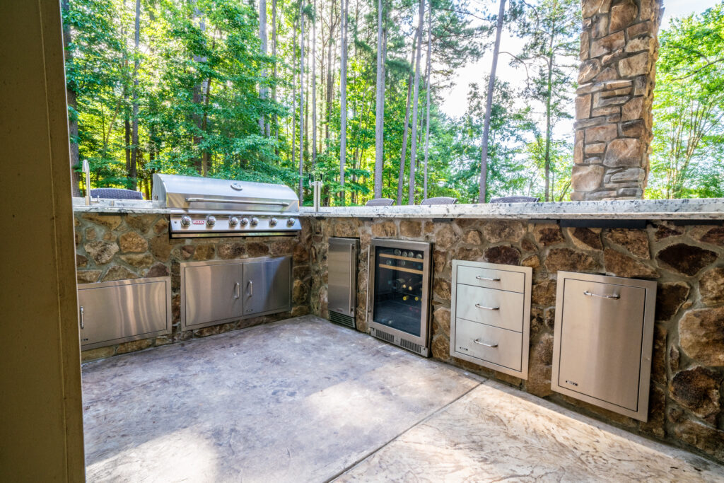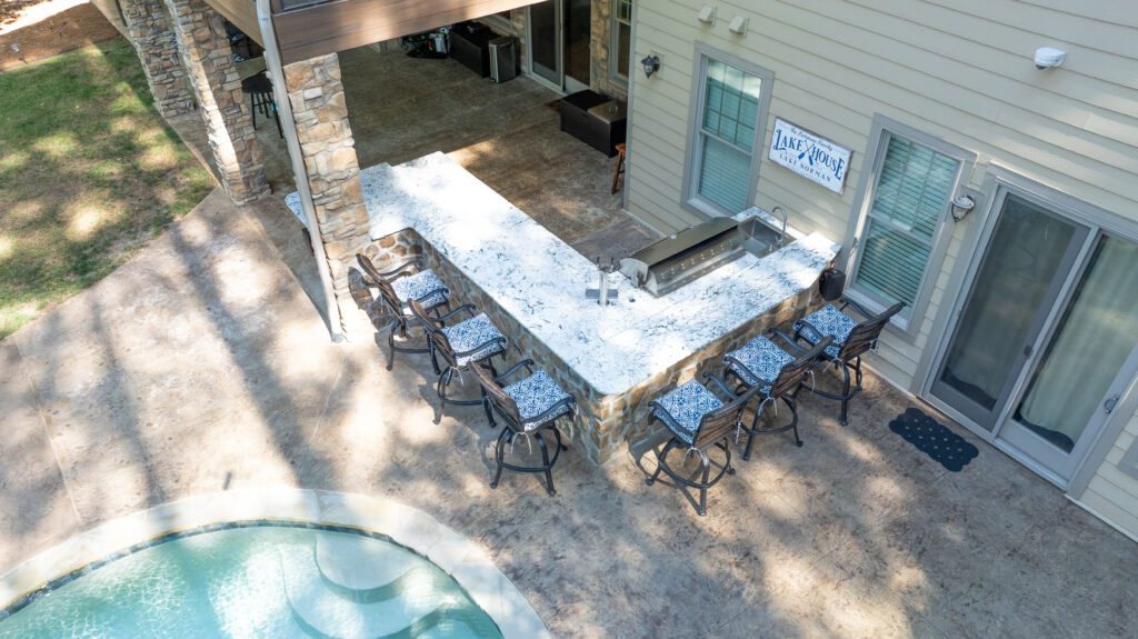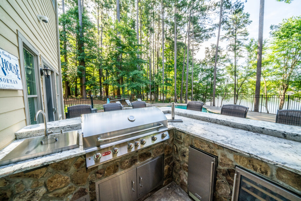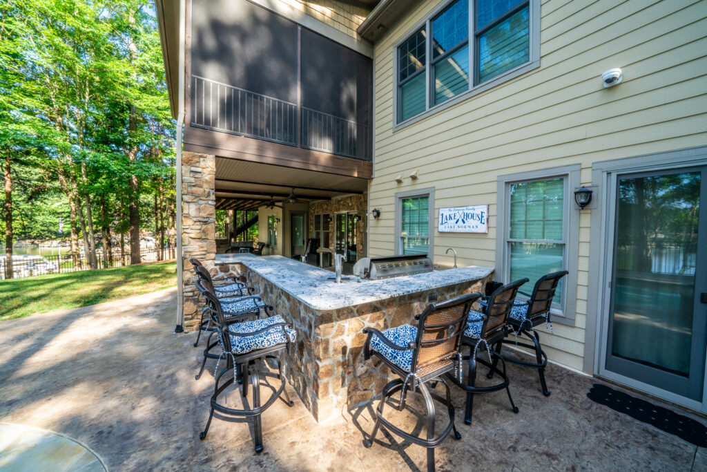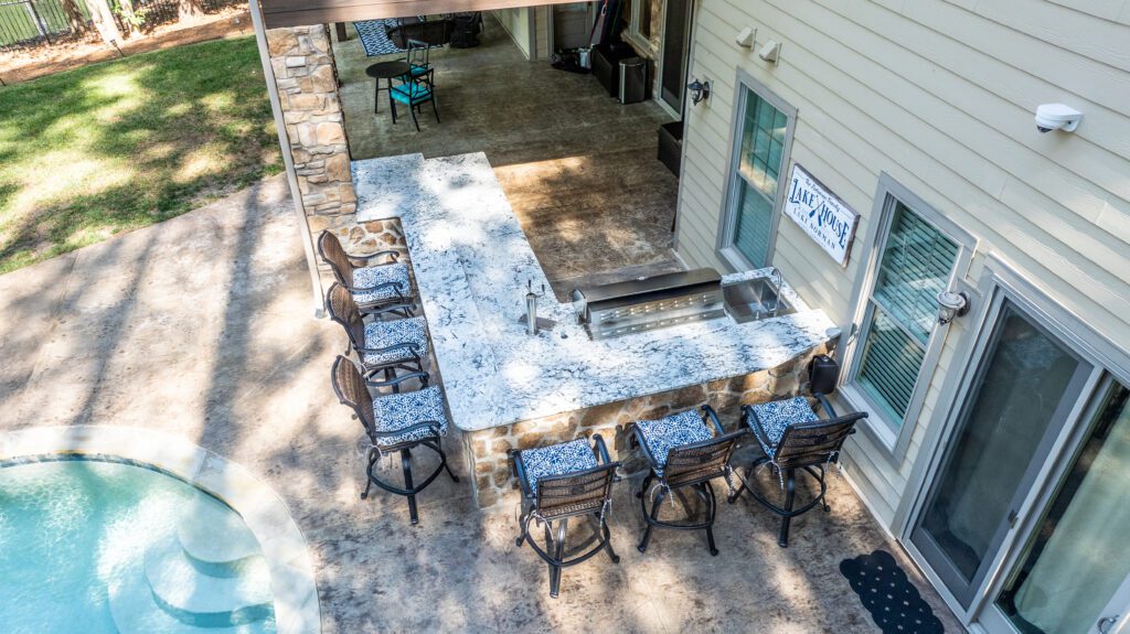 The team built an outdoor kitchen featuring a beautiful bar with an ice maker, refrigerator, grill, and amazing countertop space perfect for entertaining. Adjacent to the pool, the large remodeled patio completes the stunning outdoor oasis.