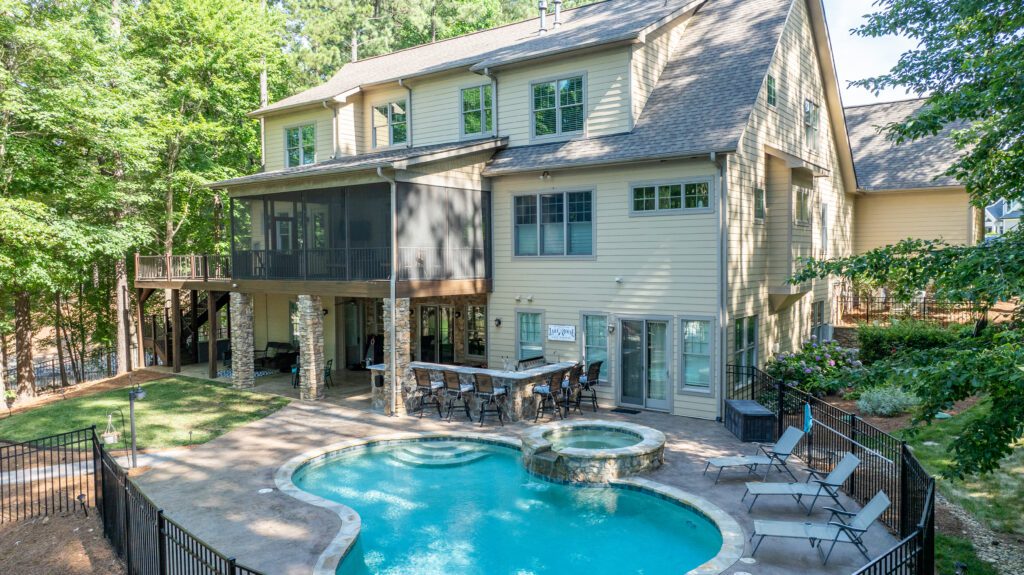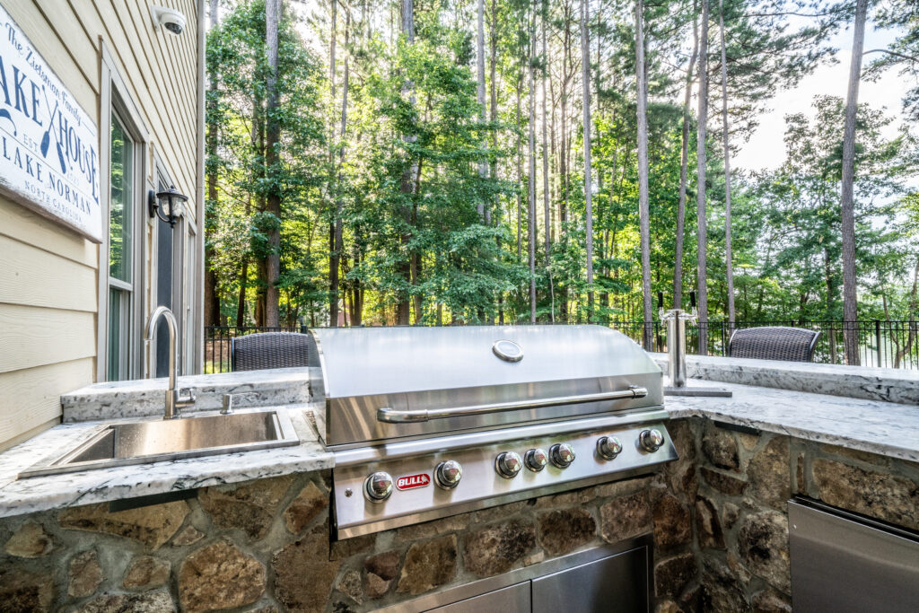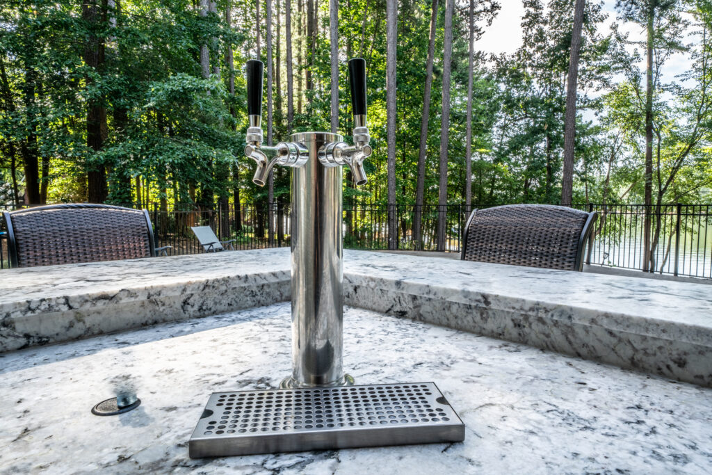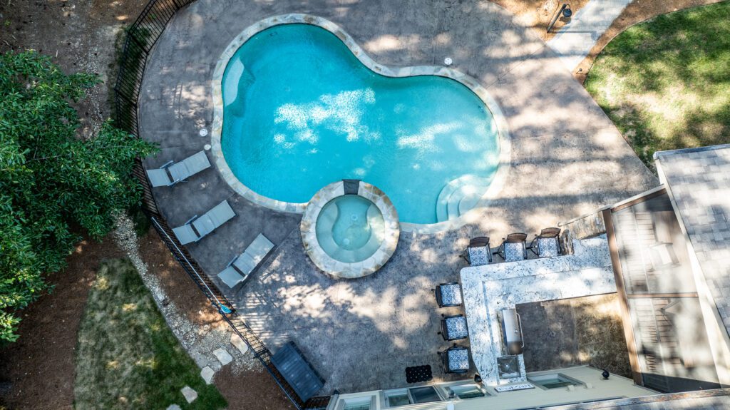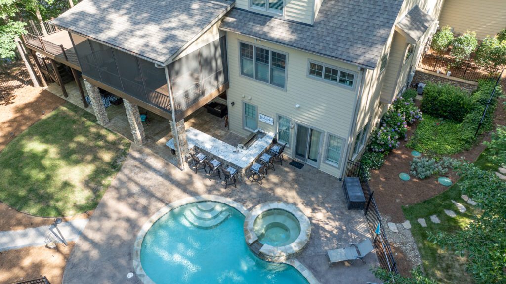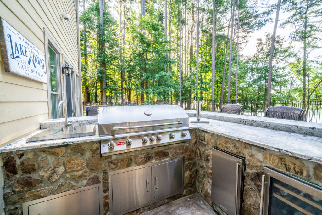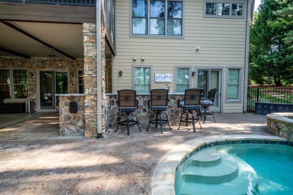 The team built an outdoor kitchen featuring a beautiful bar with an ice maker, refrigerator, grill, and amazing countertop space perfect for entertaining. Adjacent to the pool, the large remodeled patio completes the stunning outdoor oasis.