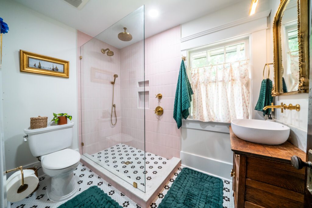 Step into a stunning bathroom that seamlessly blends vintage charm with contemporary freshness. This beautifully renovated space features classic black and white tiled floors paired with light pink tiled walls, creating a timeless and elegant backdrop. The brass finishes and accents add a touch of sophistication, while the wooden vanity introduces warmth and character. The result is a pristine, stylish bathroom that exudes a unique and inviting ambiance.