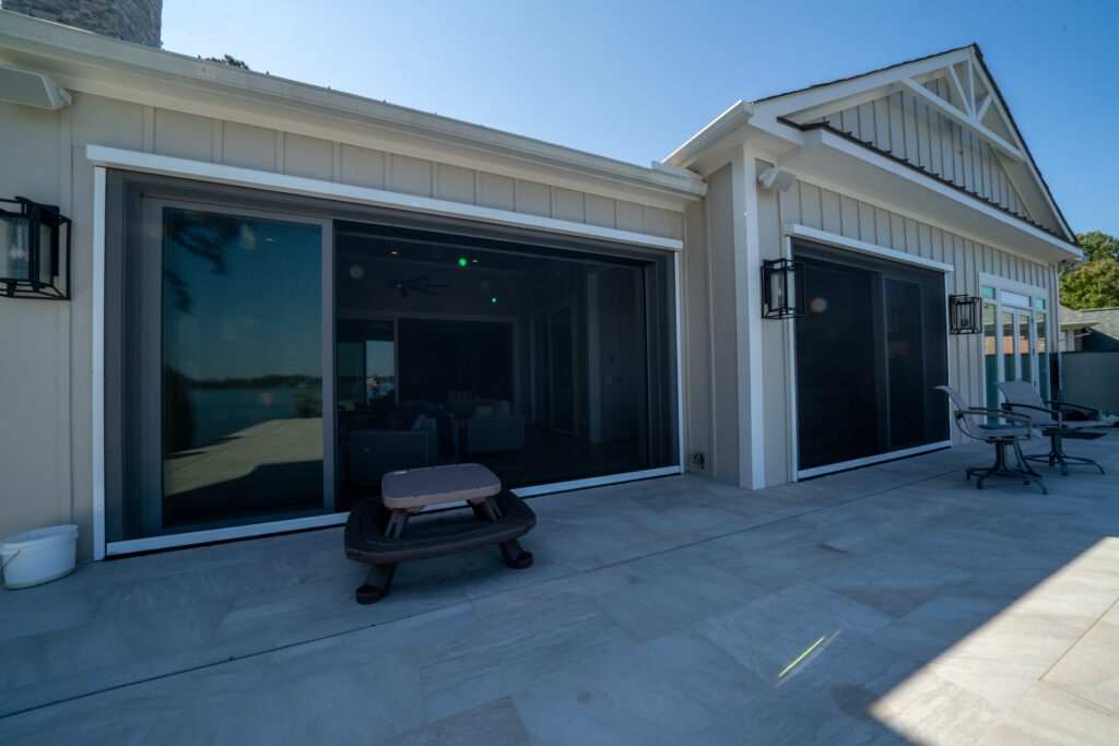A recent renovation on a lakeside property included the installation of a motorized screen, turning the back of the house into a perfect entertainment space with breathtaking lake views.