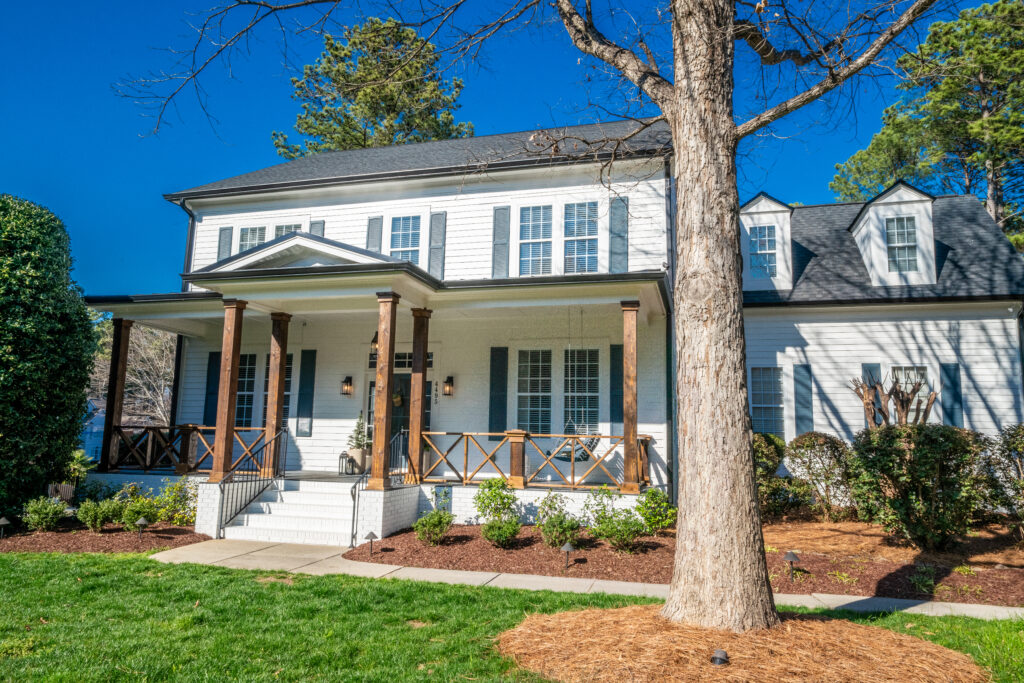 From the warm embrace of wooden railing and columns to the elegant tile flooring, each element harmonizes to create a welcoming porch and exterior that exudes timeless charm and enduring beauty.