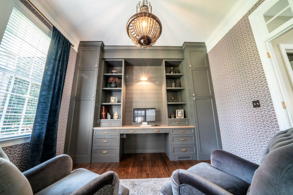 Take a look at one of our home office transformations: sleek grey cabinetry paired with charming ship lap accents and built-in shelves, all illuminated by a stunning new lighting installation. Infused with personality thanks to vibrant printed wallpaper, this space is where functionality meets flair.