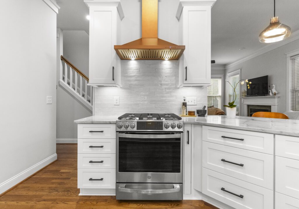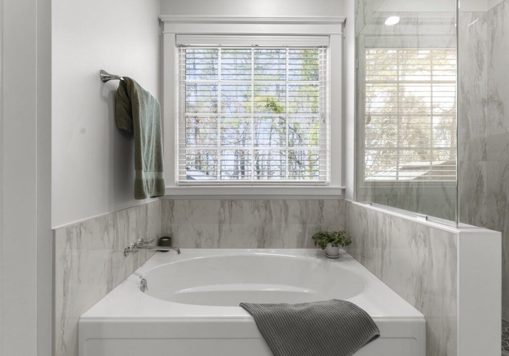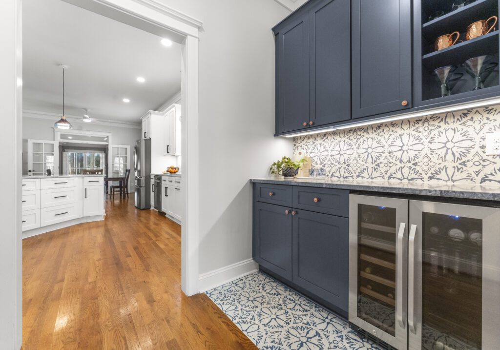 Check out this full kitchen and bathroom renovation. From custom cabinetry, sleek finishes, a new bar, double vanity, stunning tile – this new layout is open and airy.
